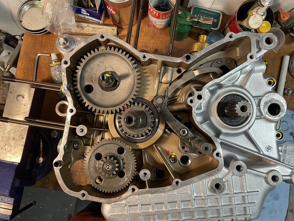 Neues Update, ich komme voran. Gehäuse ist jetzt wieder zusammen und Wellen sind aus distanziert. Die 65° Endanzug bei den Pleuelschrauben sind nicht von schlechten Eltern. Hat es mir doch glatt den 1/2 Zoll auf 1/4 Zoll Adapter gekillt😵 Nächster Endgegner: 1.Schaltgabel einstellen, ohne Spezialwerkzeug…. ich meine gelesen zu haben, dass der Haken im 2ten Gang mittig zur Schaltwalze sitzen soll. 2.Das Schwungrad von Kämna hat keine Befestigungsmöglichkeit für das Blockierwerkzeug. Auf ging die Mutter mit Schlagschrauber und Ölfilterwerkzeug. Aber 186Nm mit dem Drehmomentschlüssel wird nix mit dem Ölfilterriemen gegen zu halten.... Natürlich kann man vom Dichtungs-SET!! von Ducati nicht erwarten, dass dort die O-Ringe für die Ölpumpe dabei sind. Also nochmal Bestellen und Warten........🥴4 points
