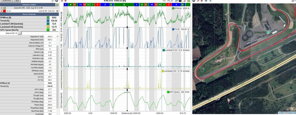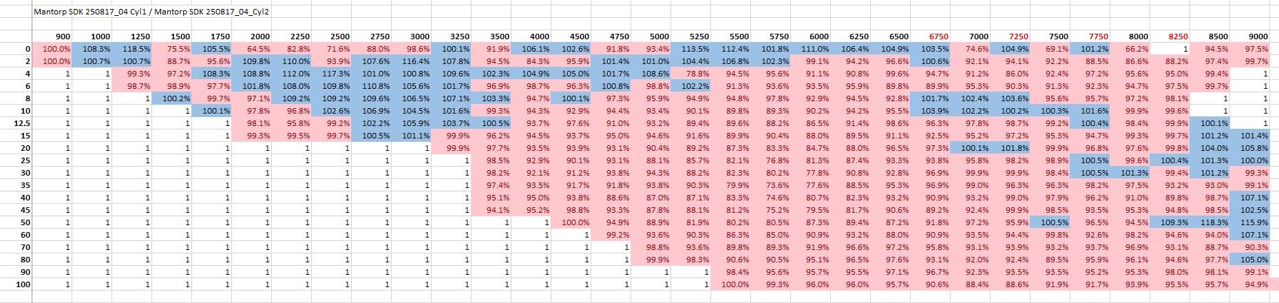 Hallå, und Entschuldigung für die Unklarheiten. Wenn man selber mit den Daten da sitzt, scheint ja alles selbstverständlich, sehe ich ja jetzt dass das nicht so ist. Also, diesen Excel habe ich nur gemacht, um die Unterschiede zwischen den beiden Zylindern aufzuweisen. Die Prozentzahlen beziehen sich auf die Einspritzdauern am liegenden Zylinder. Wo "1" steht, sind bei beiden Zylindern beide Einspritzdauern identisch. Prozentzahlen >100% bedeutet liegenden Zylinder mit längeren Einspritzdauern, Zahlen < 100% eben mehr Kraftstoff am stehenden Zylinder, alles aus den Microtec Einspritztabellen. Ein Punkt noch dazu; ich habe vor dem Sommer die Einspritzdüsen ultraschall-gereinigt und auf Einspritzwerte überprüft. Ich meine die Werte waren ziemlich vergleichbar, habe aber leider zu unpräzise Notizen gemacht. Im laufe der kommenden Winterservice werde ich das wiederholen, und im Betracht nehmen. Bis dann also die Werte mit etwas Vorsicht geniessen, Einspritzdauer und Einspritzmenge sind ja nicht unbedingt das gleiche. Gruss, Torbjörn. Edit: Zu den AFR-Spitzen: Ich habe keine gute Methode gefunden, ie zu vermeiden. Sie scheinen jedoch nicht den M163-Gerät gewaltig zu stören. Auf die renne zu fahren, ohne Motorbremse finde ich unmöglich, und, wenn man nicht alleine auf die Strecke ist, gefährlich. BEim Auswerten hilft es dan sehr, dass man sehen kann wo man auf die Strecke ist. Man weiss ja ungefähr, wo man Gas gibt, und wo nicht.