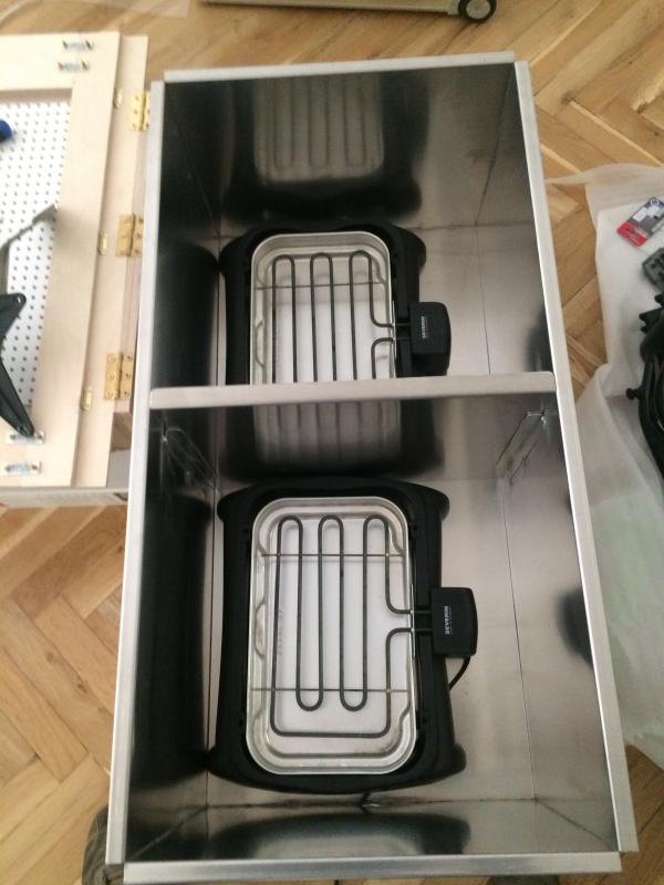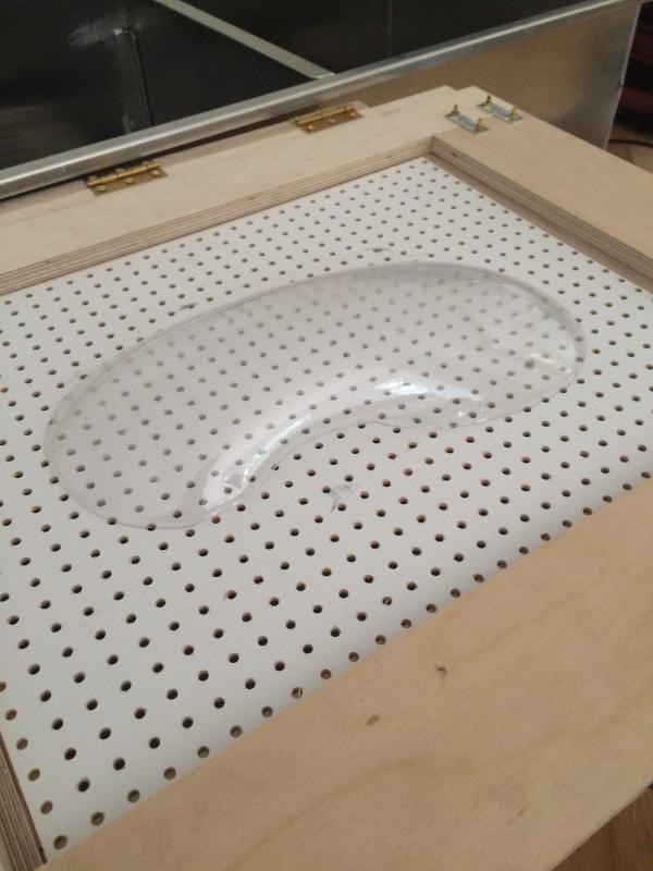 Jetzt ging es darum eine Vorrichtung zu bauen um Positivformen aus Vivak tief zu ziehen. Vivak ist von Beyer. Es sind Kunststoffplatten, durchsichtig und in verschiedenen Stärken. Wenn man das Vivak erhitzt wird es weich und legt sich unter Vacuum um Gegenstände. Also erst einmal eine Holzkiste bauen, die aussieht wie eine Schublade. Das ganze von innen mit Silikon abdichten. An einer Seite ein Loch bohren um den Staubsauger anschließen zu können. Dieser soll dann das Vacuum erzeugen.