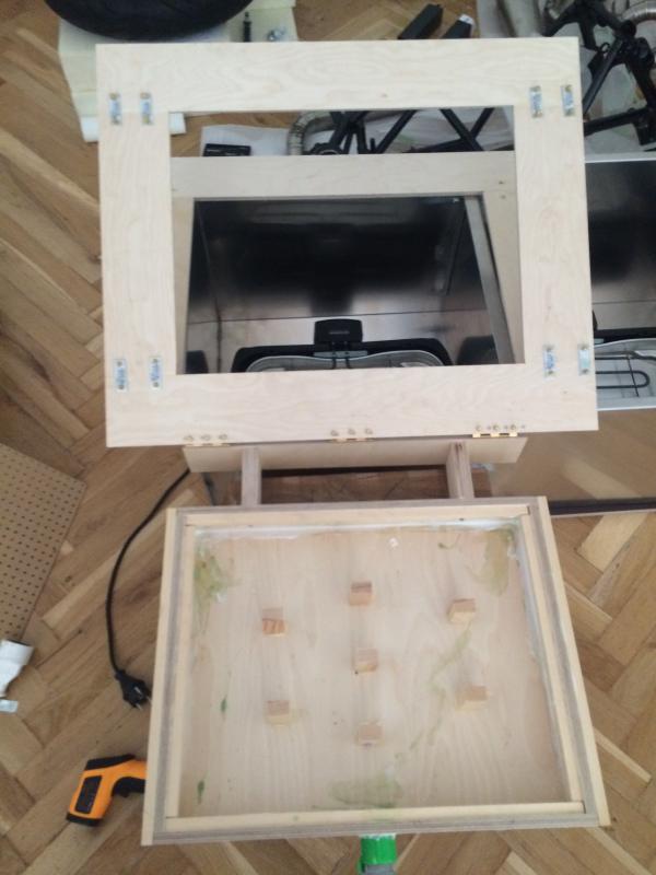 Dann habe ich einen Doppelrahmen gebaut in den man die Vivakplatten einspannen kann und diesen mit kleinen Scharnieren an die Holzkiste angebracht.