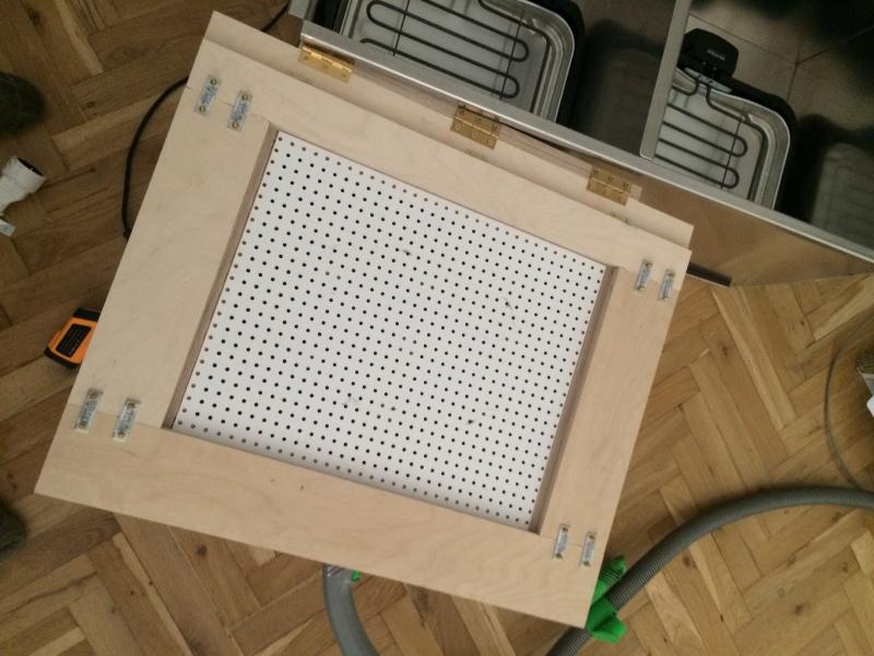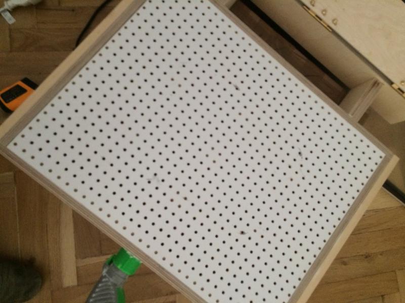 Einen Innenrahmen bauen und Holzklötze als Verstärkung reinkleben, damit die Lochplatte die dann eingesetzt wird nicht bricht, sobald man den Staubsauger einschaltet.