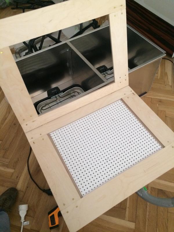 Jetzt kann man den Rahmen mit der Vivakplatte über die Wanne klappen und durch den Tischgrill die Platte erhitzen. Zwischenzeitlich legt man das Positiv auf die Lochplatte, schaltet den Staubsauger an und wenn das Vivak die richtige Temperatur hat, klappt man den Rahmen einfach über die Holzbox und schon erhält man eine perfekte Negativform.