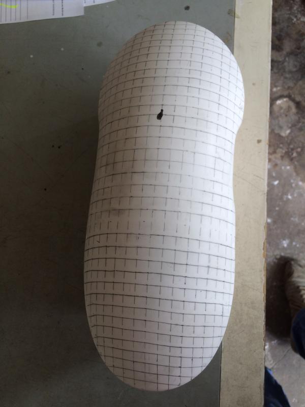 Ich habe also eine kleine Holzkiste gebaut in die ich meine Vivak-Negativform reinlegen konnte. Dann habe ich Tipps reingegossen um eine Ausdehnung oder Plattliegen der Vivakform zu vermeiden. Somit habe ich die Form eingebettet. Danach habe ich die Creartec Masse reingegossen. Da ich ja das Positiv noch weiter bearbeiten wollte, habe ich in die noch flüssige Masse Holzdübel gesteckt. Im Baumarkt für 5 Euro einen Holzblock besorgt. Die Holzdübel an den Enden mit Farbe angestrichen, dann auf den Holzblock gestellt und da wo die Farbabdrücke waren Löcher gebohrt und das Positiv draufgesteckt und mit Holzleim verklebt. Von oben betrachtet sah ich dann, dass das original Schutzblech nicht symmetrisch war. Also habe ich ein Gitternetz draufgezeichnet um es dann symmetrisch zu schleifen. Hier einige Fotos von dem Teil: