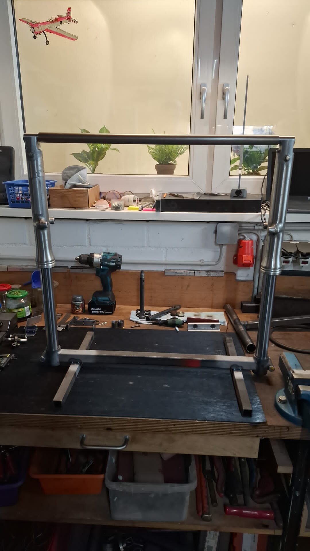 Also die Karre rückwärts (kommen noch kleine Rampen dran) über den Ständer schieben, Querrohr samt Schonauflage einsetzen und aufs Pedal treten. Karre steht dann mit dem Arsch oben und man kann bequem Rad, Schwinge, Dämpfer usw abbauen.