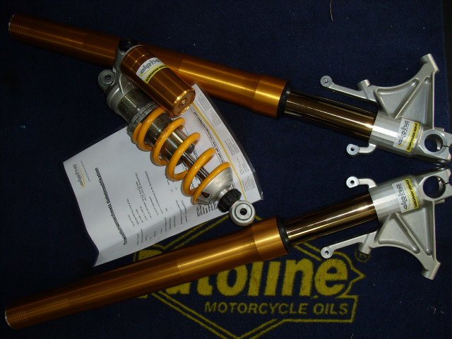 Nun zum Fahrzeug: 999s mit linearer Umlenkung und dazu passenden Öhlins Dämpfer , die Gabel steckt mit einem Ring durch.