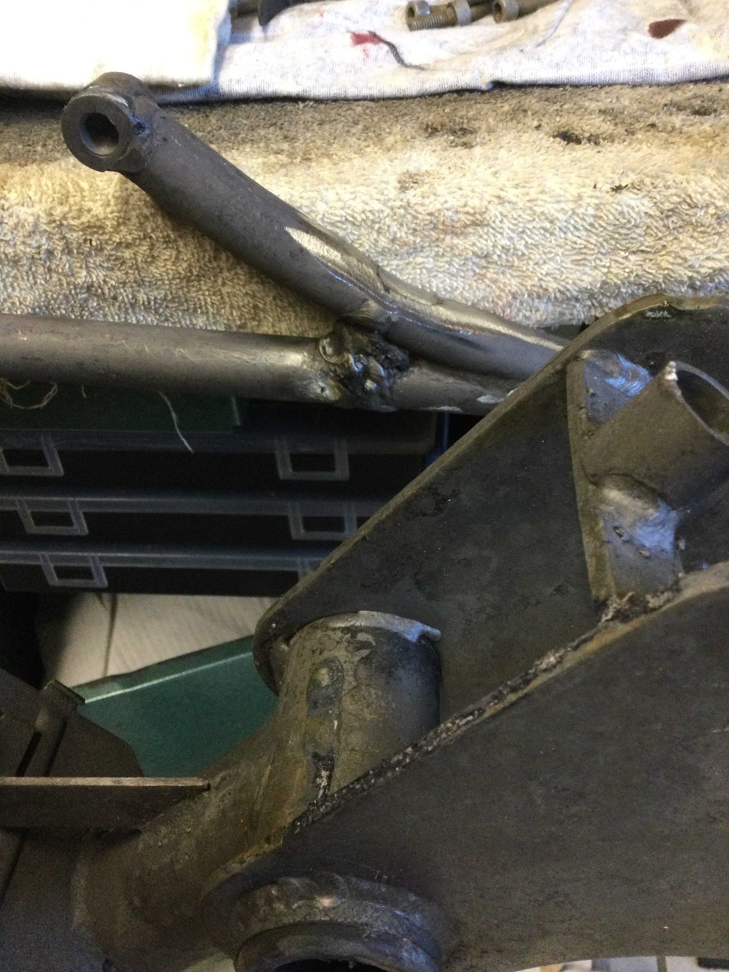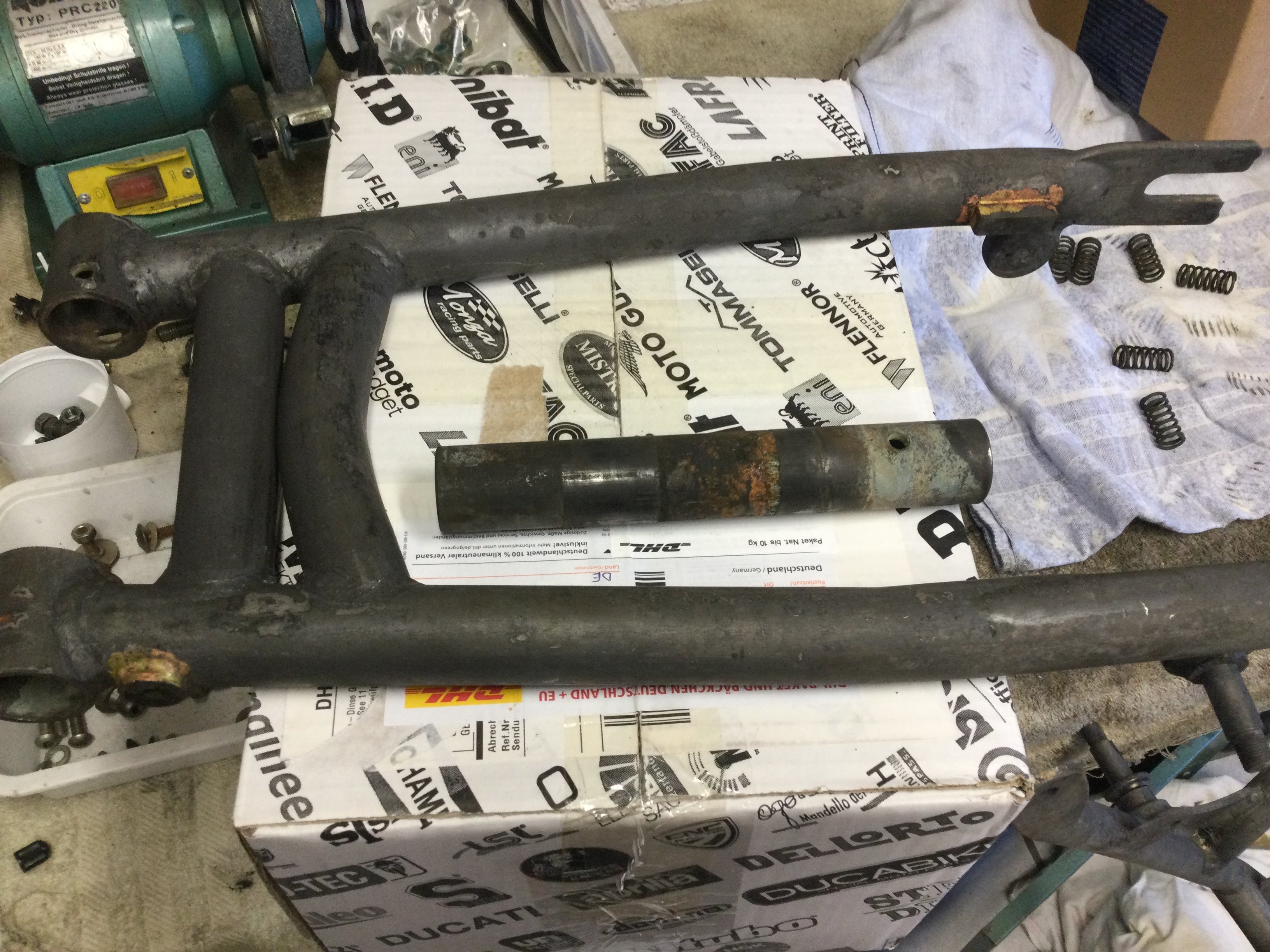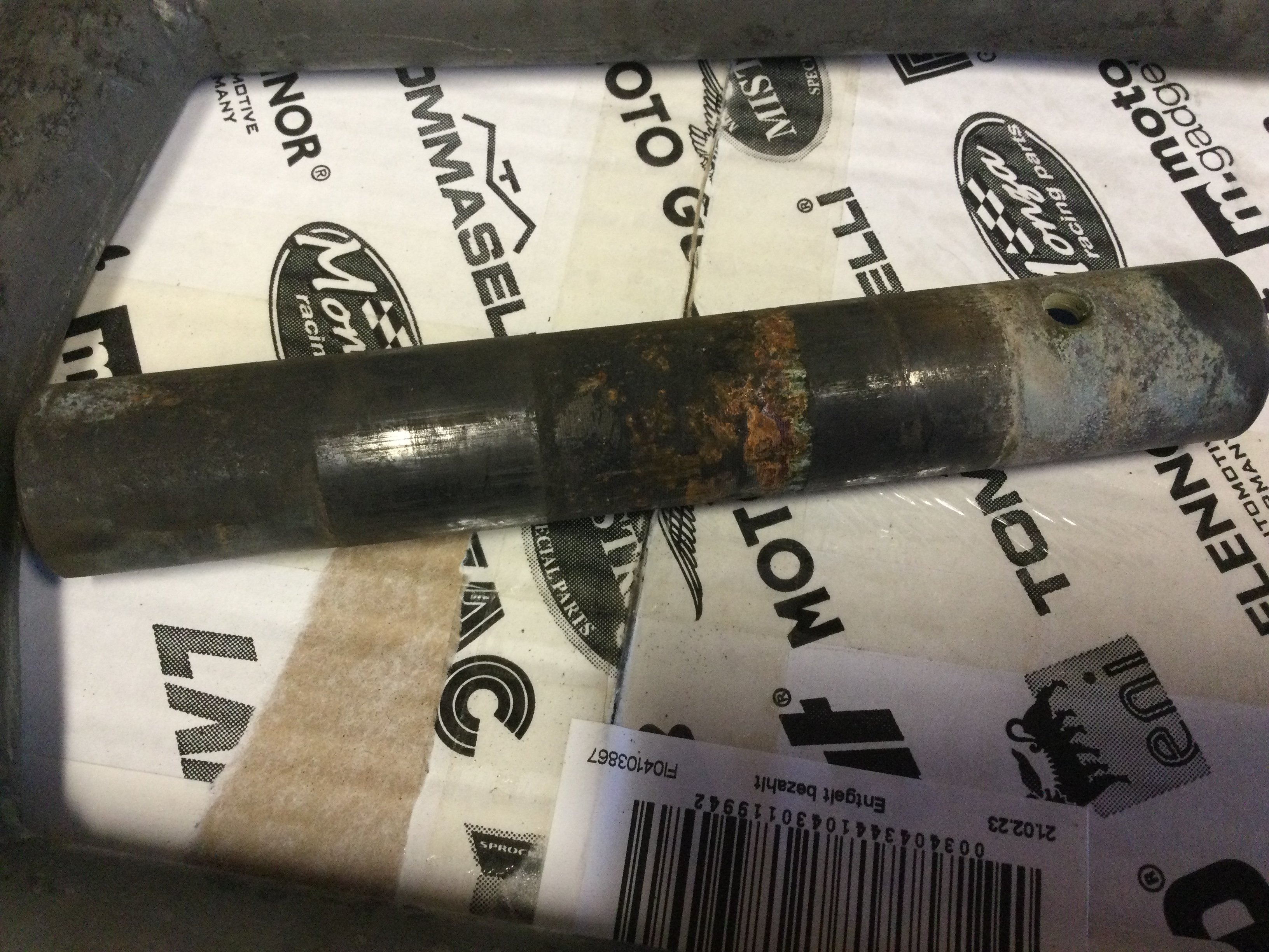 Heute konnte ich endlich die Schwinge vom Rahmen trennen. Alle bisherigen Versuche waren gescheitert. Der Rahmen musste unter die Presse. Bei 2,5 Tonnen Druck gab die Schwingenachse endlich nach.Dann konnte ich die Bereiche mit der Flex und dem Dremmel bearbeiten, wo ich mit eingebauter Schwinge nicht hin kam.