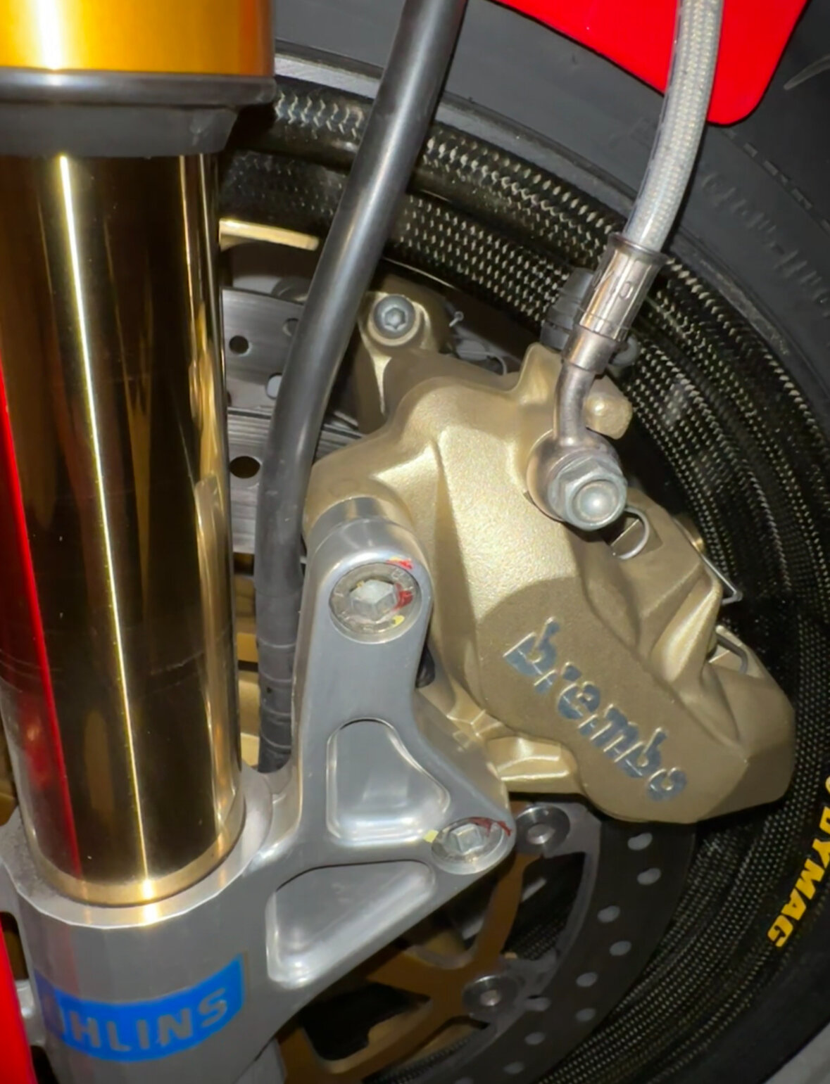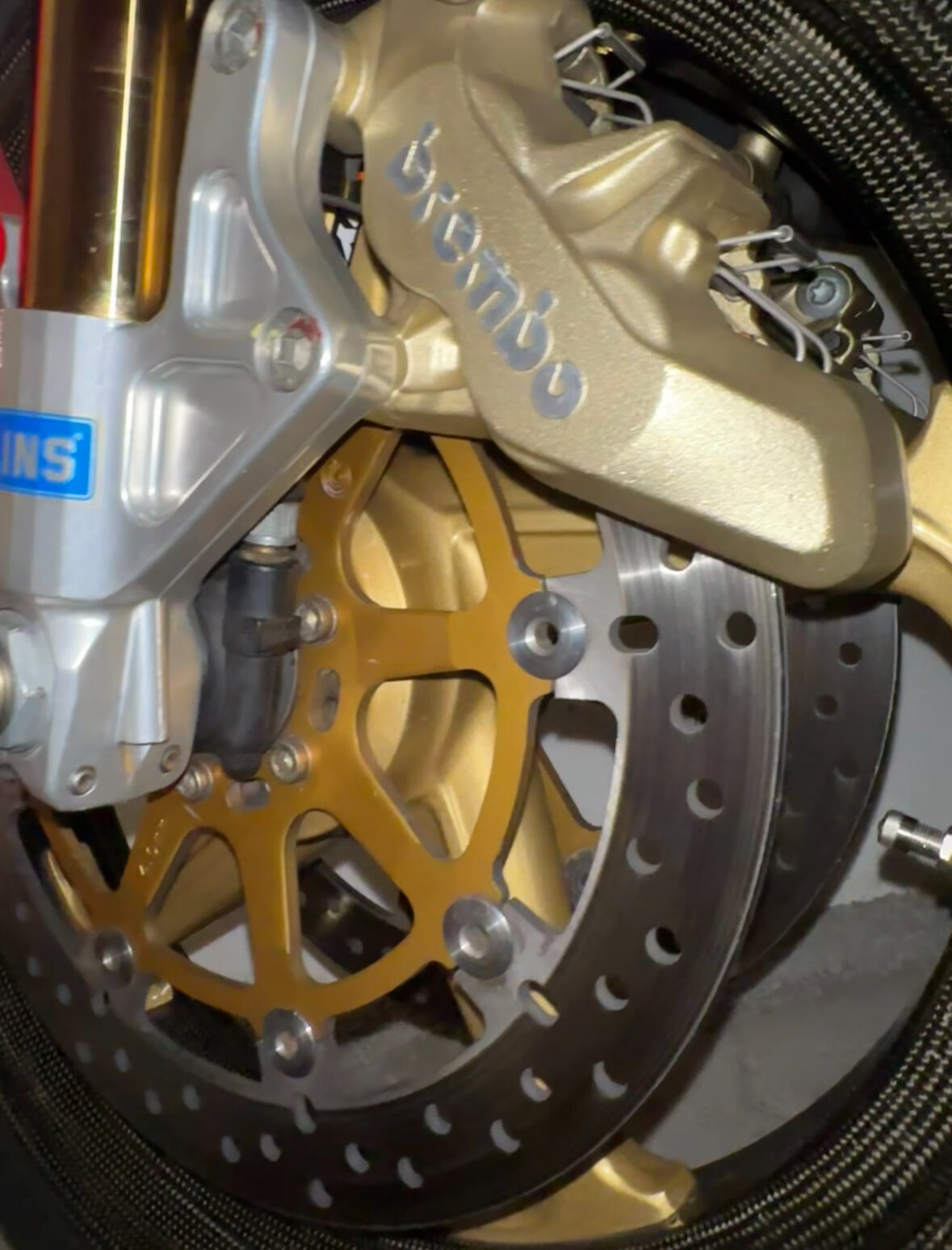 die Bella hat eine Öhlins-Gabel aus der 998R, die serienmäßigen 5-Speiche-Marchesinis und die serienmäßigen P4 30/34 auf den Schneeflocken-Scheiben.