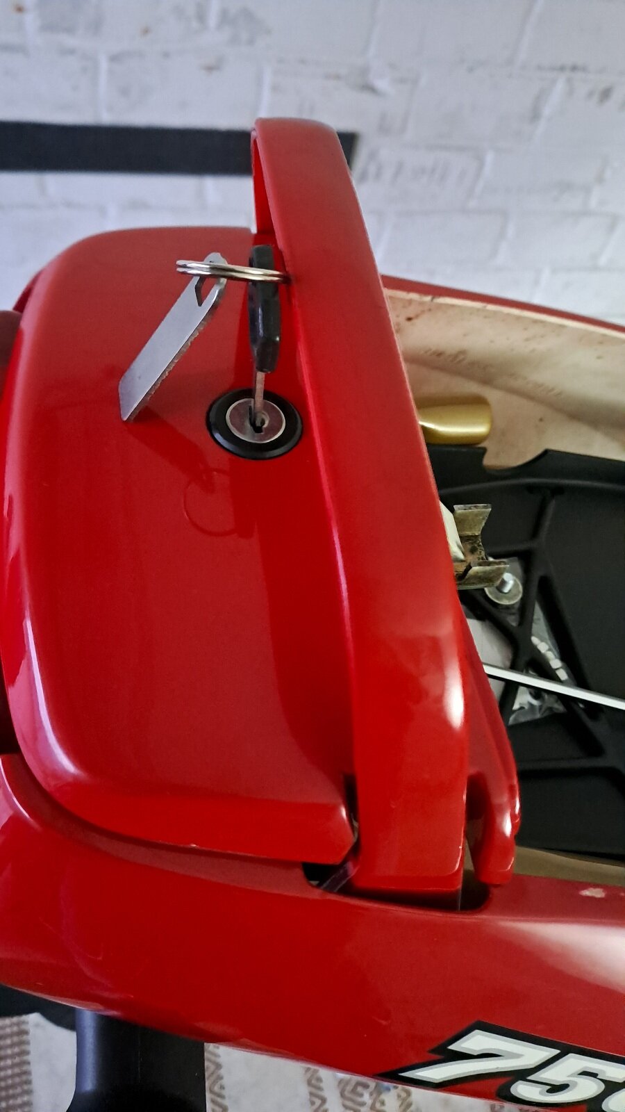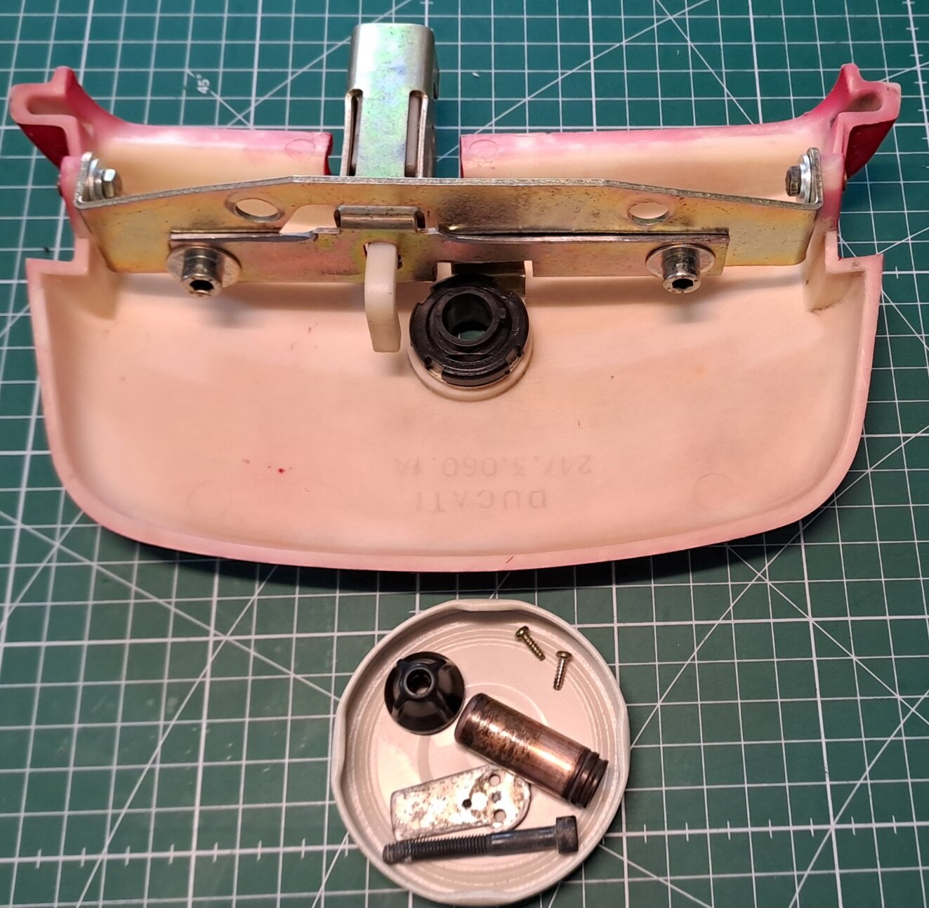 Ich habe es nicht geschafft eine Position zu finden, in der die Spaltmaße passen und der Schlüssel reingeht. Das war mir jetzt zu doof und nun ersetzt ein formschöner Drehgriff aus der Altteilekiste das Schloss. Lustig ist, dass dabei die alte Auslaßventilführung der Ducati als Buchse dient.