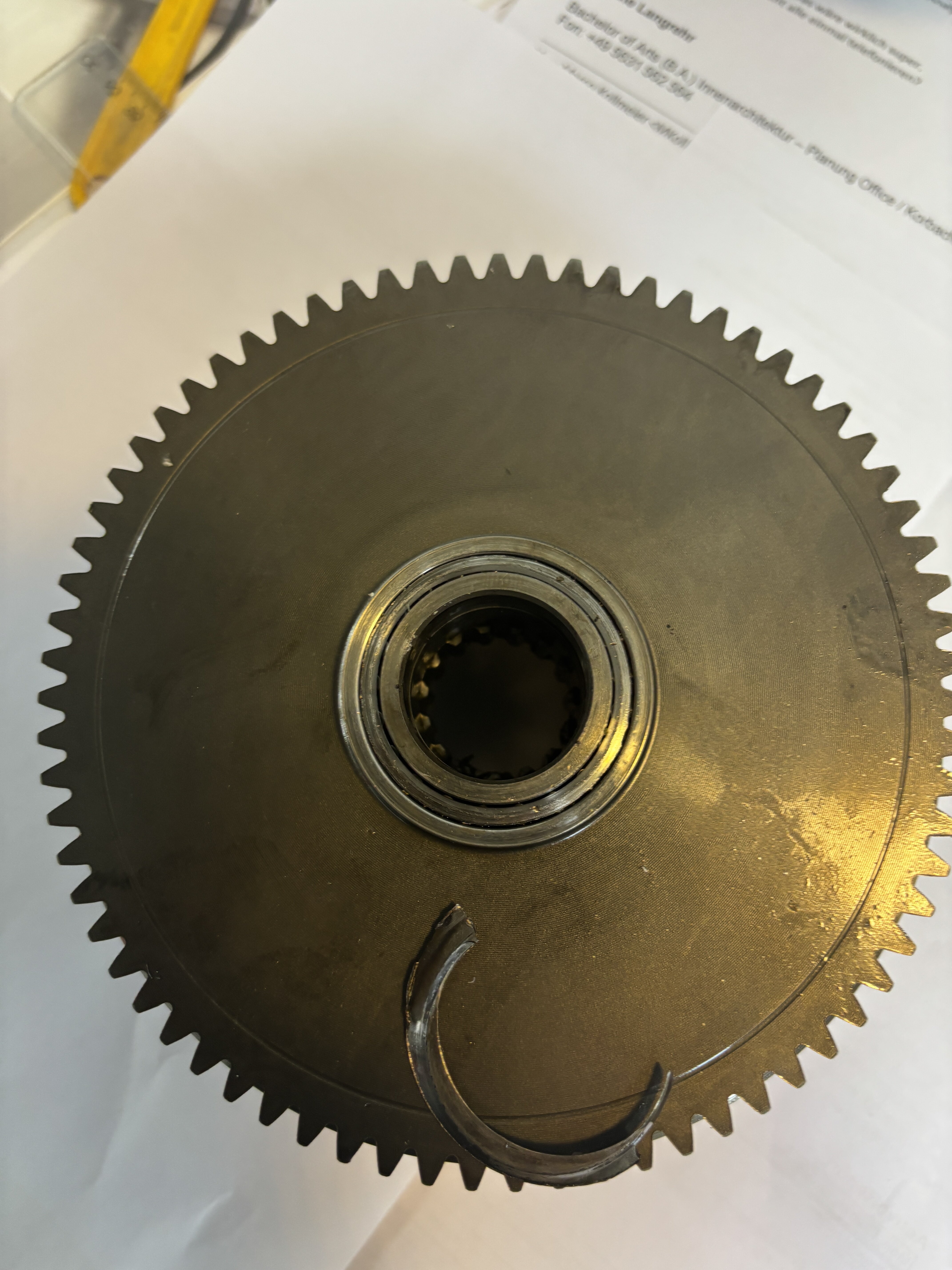 Ich habe die Motorhälften noch nicht getrennt, aber soweit einiges schon zerlegt, dabei sind mir Fragmente einer Scheibe entgegengekommen die wohl mal unter dem Freilauf montiert war, auch sieht man an dem Nadellager vom Freilauf das da mal was gearbeitet hat.