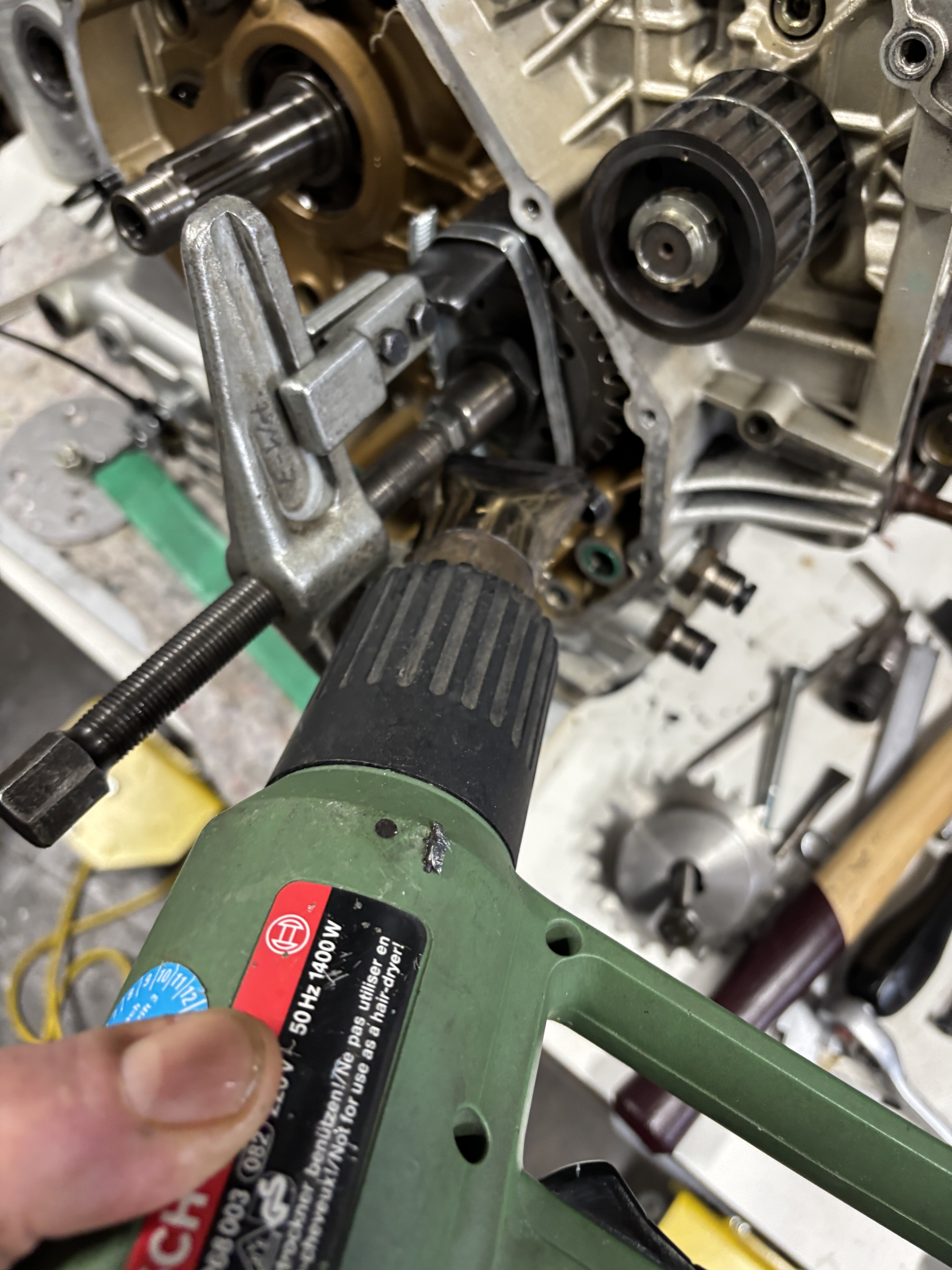 1 Das Zahnrad von der Zwischenwelle ist runter, hat sich allerdings sehr gewehrt, erst mit einem Zweiarmabzieher probiert, mit Hitze, zeit und Kälte Spray. Erfolg: beim Abzieher einen Arm geschrotet. Dann habe ich auf die Schnelle einen Abzieher aus Resten zusammen gebraten, den hat es auch erst verbogen, Verstärkung hinzu und wärme dann ist das Zahnrad irgendwann abgeflogen…