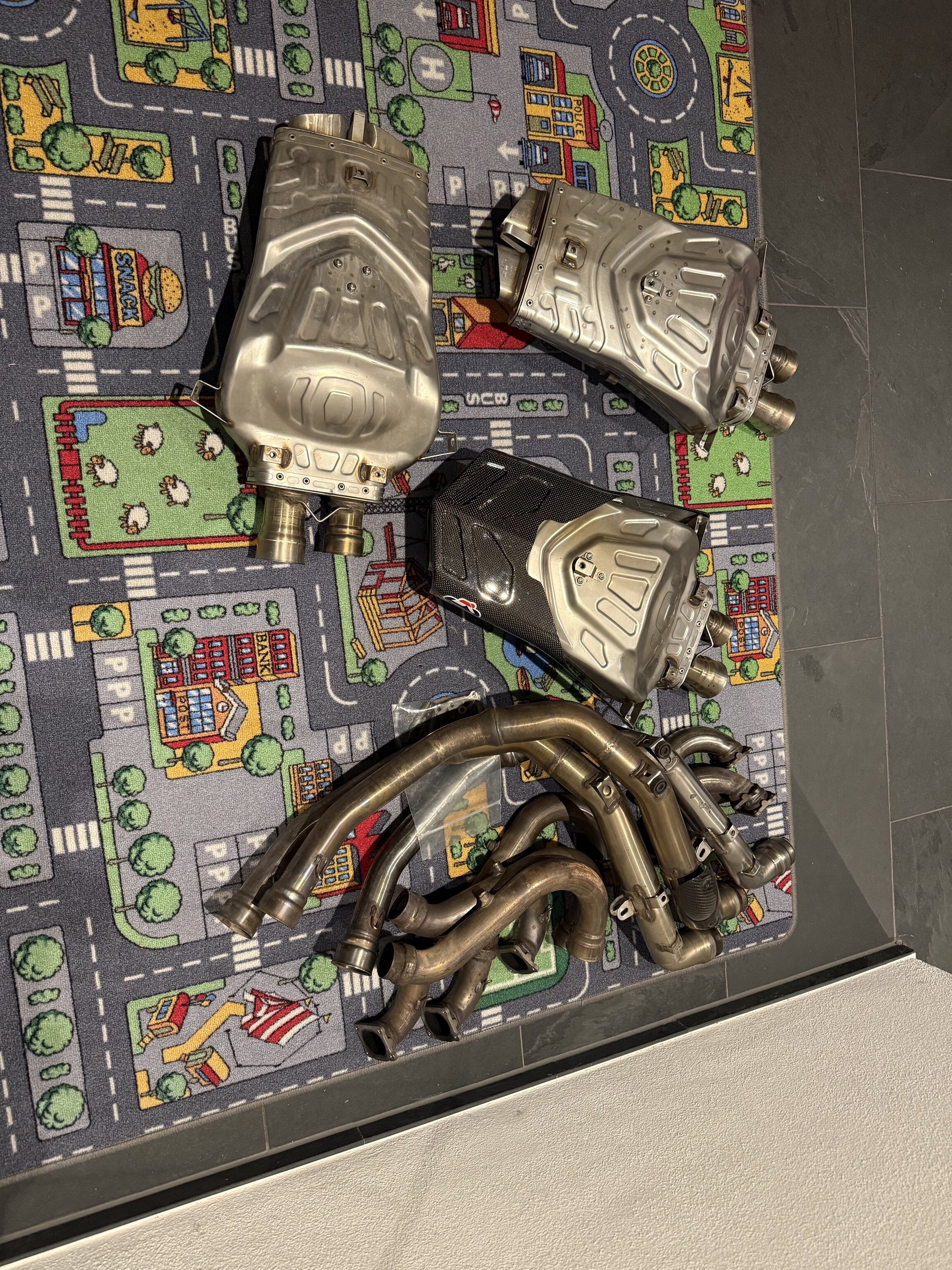 Aktueller Stand. Vier Termignoni Raceanlagen sind besorgt. Eine wird original bleiben. Zwei kommen erstmal ins Regal als Reserve. Bei der vierten wird gerade der Endschalldämpfer aufgeflext mit dem Vorhaben die rund-ovalen Absorber mit dünnem Blech Stück für Stück zu überdecken und zu testen. Die Krümmerrohre lasse ich sauber thermoisolieren. Ich teste dann durch: Krümmerrohre isoliert, nicht isoliert, Endschalldämpfer bearbeitet, unbearbeitet usw.