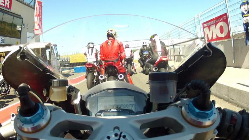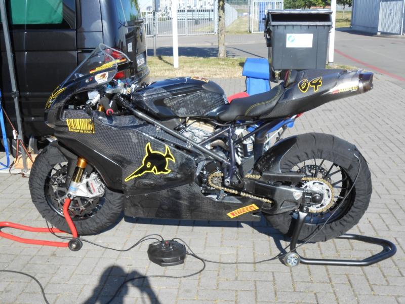 Freitag gleich ging‘s dann wieder los, ich meine die Anzahl der Gruppenteilnehmer war kleiner als noch am Tag zuvor, kann mich aber auch irren - kann aber auch gut sein, da wir den ein oder anderen Zweizylinder ziemlich verunstaltet auf dem „Lumpensammler“ sahen und vieleicht der ein oder andere zu tief ins Glas geschaut hatte – wer weiß? Ich habe dann Freitag mein heil in der Flucht nach vorn gesucht, also möglichst als erster in die 20 Minuten zu gehen – dann hatte ich so 2-4 freie Runden das war wirklich gut, im späten Vormittags Turn dann mit Schaum vorm Mund - wie früher , Bang 38:xxx, Bang 37:0xx, BangBang 1:36.017 stand plötzlich auf dem Display , OK ein wenig gemogelt, in der Schikane vor der Gegengeraden bin ich gerade durch…- yeah Schwerti und Hacklschorschi werden warm!!! Und wieder im Verkehr 42:xxx 43:xxx 47xxx – ich lass es gut sein und entscheide mich für Defensiv – zumal ich mit spannendem Kombi natürlich auch ein wenig mit der berühmten Schnappatmung zu tun habe – da könnte ich dran arbeiten… . Im ersten Nachmittagsturn – Asche auf mein Haupt bleibe ich noch liegen weil..ich mags gar nicht schreiben..mir der Treibstoff ausging – heim mit dem Lumpensammler – als wir am BlackBully ankommen ist Cerstin schon ein wenig geschockt – is ja nix passiert, ärgere mich über meine eigene Dummheit, das darf nicht passieren in meinem Alter! Ich nehme dann noch alle Turns mit, muß aber gestehen das mir dann die langsam Kräfte ausgingen, jeweils 20 Minuten, OK aber nicht mehr mit dem Messer zwischen den Zähnen, die hohen Temperaturen und das stetige bändigen der schieren Gewalt des Evoluzione fordern ihren Tribut. Fazit: Beide Hände zieren Blasen vom festkrallen, ich gehe am Samstag wie Robocop, eine Auspuff-Feder und drei Schrauben verloren , einen 200er SC2 durchgeritten, ~40 Liter V-Power konsumiert, die Sitzbank aufzupolstern war ein goldgriff und sehr nette Menschlinge kennen gelernt – für uns waren es zwei klasse Tage bei den TwinsOnly von MO!